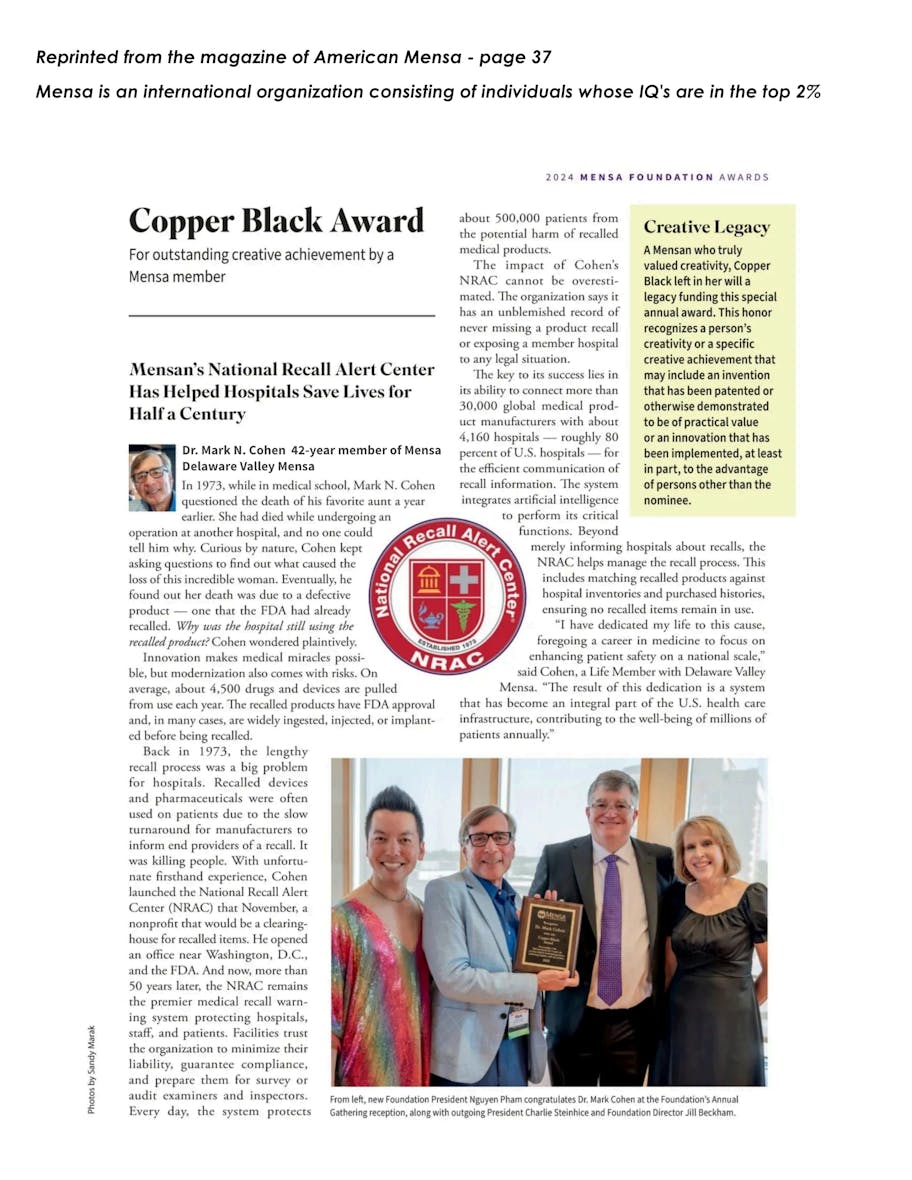 Dr. Mark N. Cohen, lifetime MENSA member and founder of the National Recall Alert Center (NRAC), receives the 2024 Copper Black Award for Creative Achievement. His innovative system has safeguarded millions of patients from recalled medical products for over five decades, exemplifying the award's recognition of outstanding innovations that benefit society.